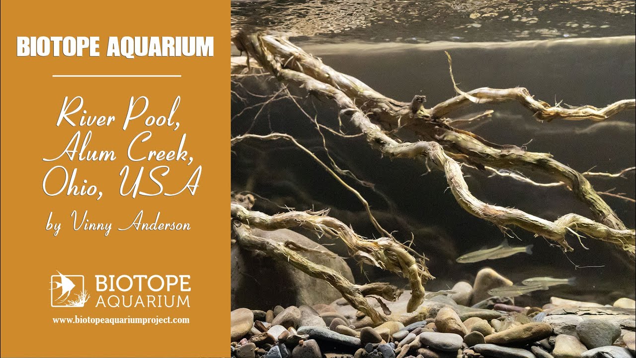 A pool alongside the river bank of Alum Creek. Twisting roots of an invasive honey suckle species replicates the exposed roots of large American Sycamore trees found along the natural river banks. The substrate is river washed sand stone, with no aquatic vegetation present. A small group of Cyprinidae Campostoma (Stone Roller) and Percidae Etheostoma nigrum (Johnny Darter) were selected to represent the fish species found in these pools.