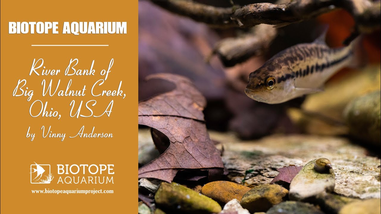 River bank of Big Walnut Creek. Twisting roots of an invasive honey suckle species replicates the exposed roots of large American Sycamore trees found along the natural river banks. The substrate is river washed sand stone, with no aquatic vegetation present. Large stones are secured in place by the roots of the trees, aiding in river bank stabilization. A sole Micropterus punctulatus (spotted bass) youngling waits amongst the cover of roots.